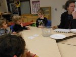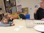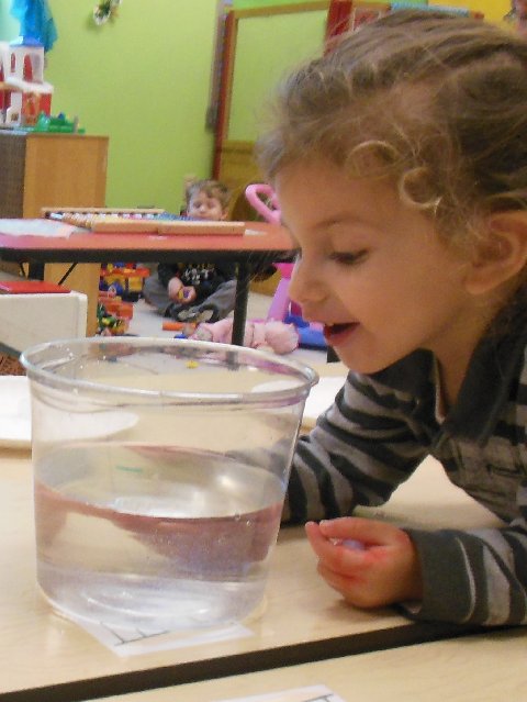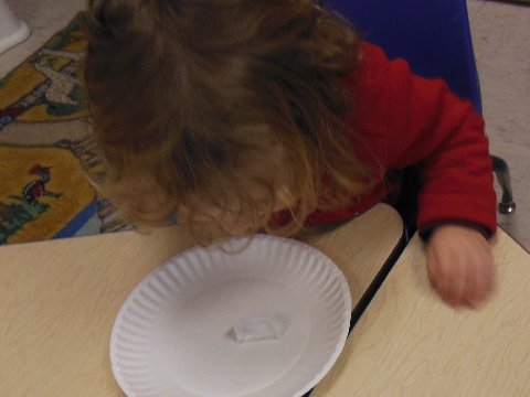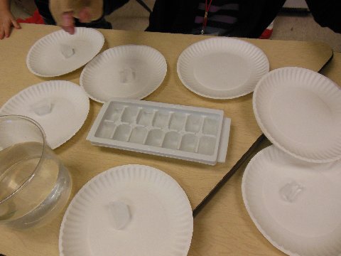 First, we put an ice cube in a big container of water and another ice cube on a plate – just to see what would happen to them during class.