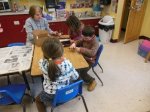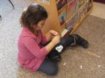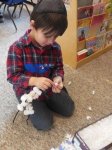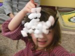 Scattered throughout the room were boxes, each containing one specific type of snow crystal (a.k.a. packing peanut). No two boxes held the same type. Each time we stopped at a box, we added six packing peanuts to our snowflake – one on each pipe cleaner tip.