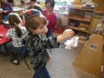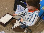 Finally, we talked about how real snowflakes form. Snow crystals form when water in a cloud sticks on a tiny piece of dirt in the air and freezes. As the snowflake blows around in the cloud, more water freezes onto the outer edges.