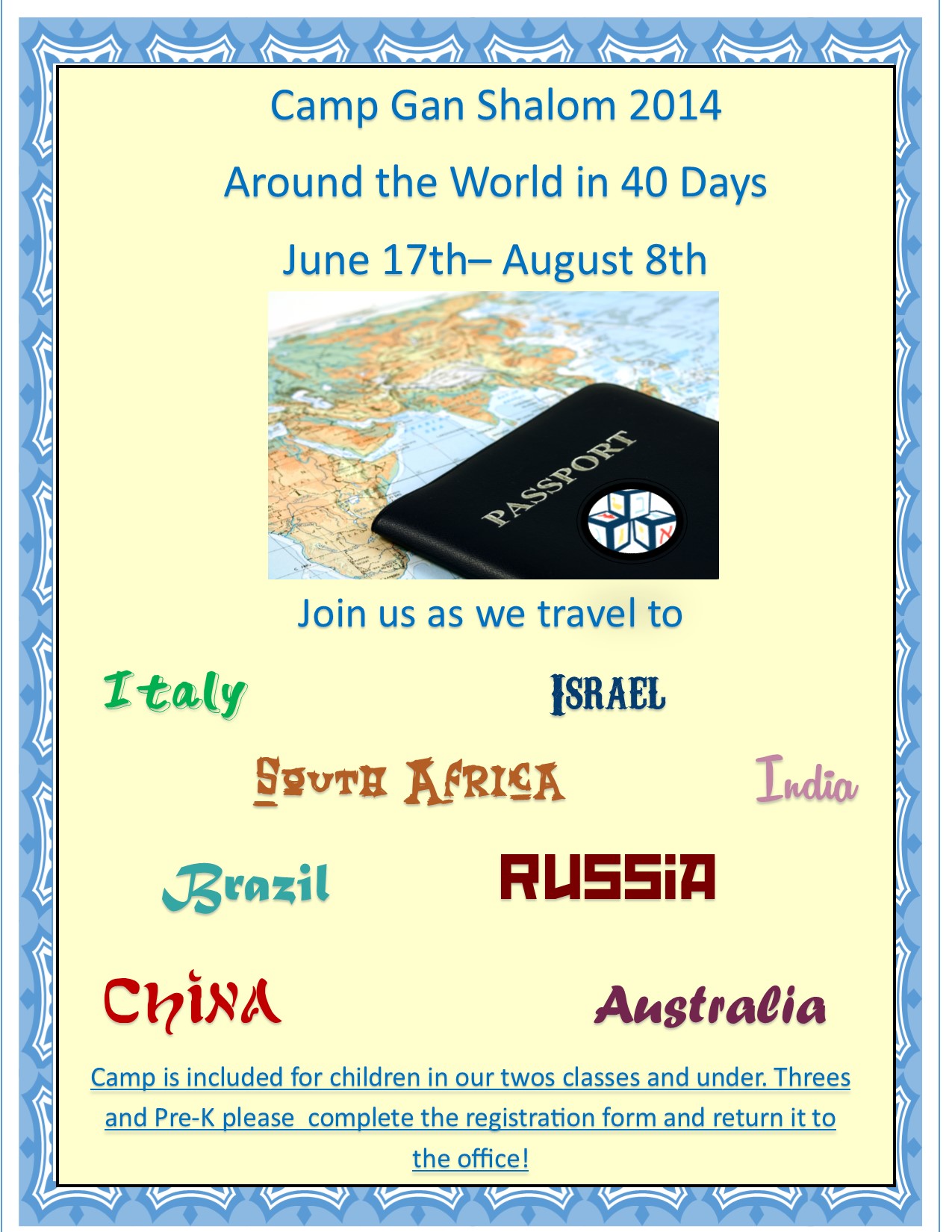 This summer we are going “Around the World in 40 Days.” Each week we will visit a new country. On our list: Italy, South Africa, Israel, Russia, India, China, Australia, and Brazil. For the different countries we will learn about food, clothing, customs, games, songs, and art. It is also a unique opportunity to have parents in our center who are familiar with these different countries to come and share with our children. It is a great opportunity for our children to experience different cultures right here at Beth Shalom.