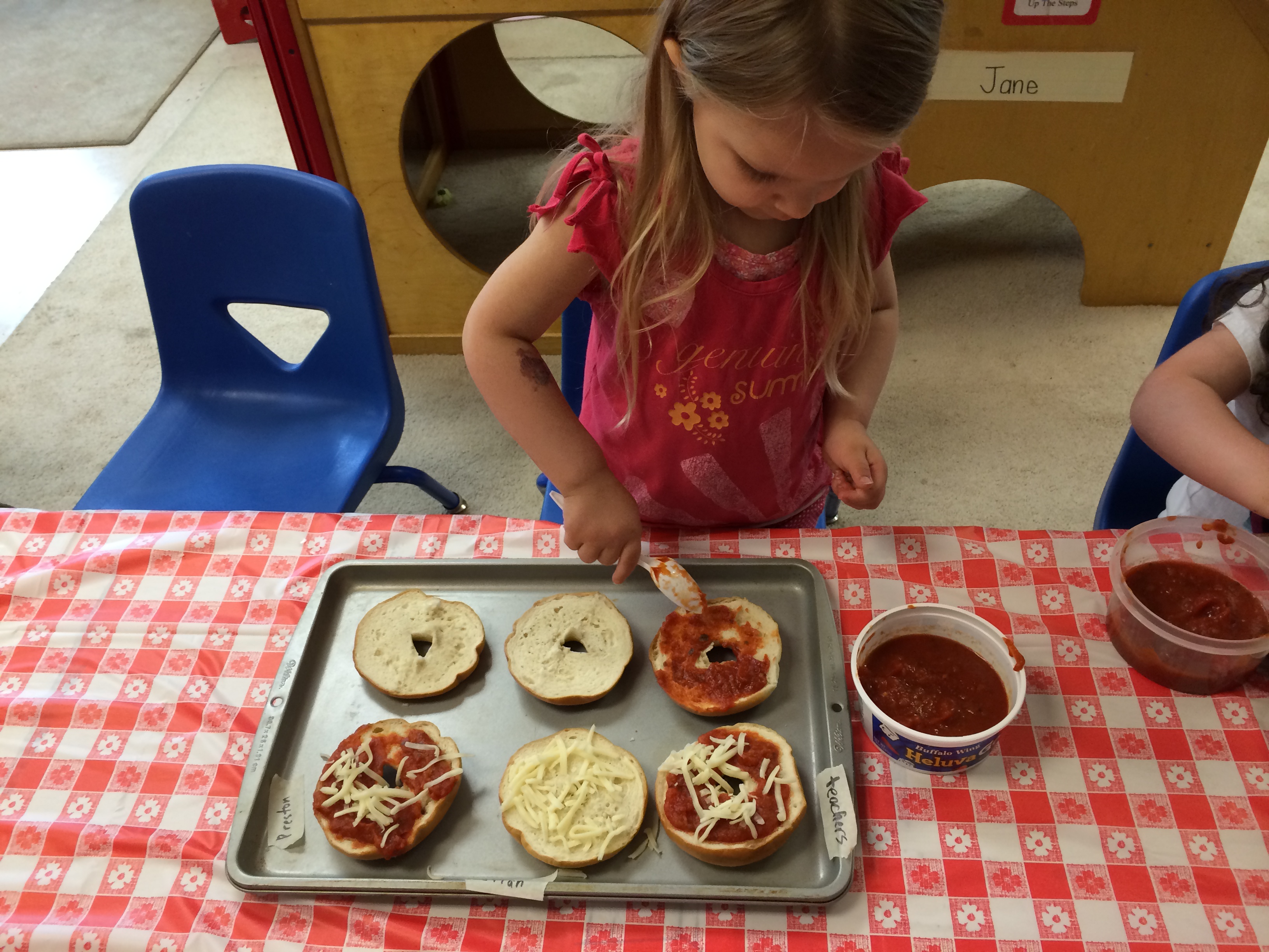 The week we went to Italy we had a special visitor-Ms. Michele. She taught us colors and numbers in Italian. We also made bagel pizzas, found Italy on a map, and did a pasta shape match.
