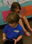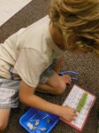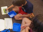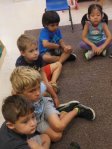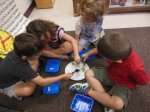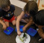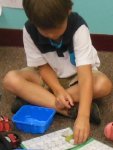We sat in groups of 4-5 around plates. Everyone got an empty blue container and a tool (either a spoon, clothespin, tweezers or tongs).