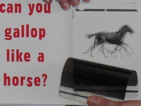 The transparency masks all but one of the image sets at any given time. When the left-hand page is opened up, it pulls the striped transparency to the left, revealing the different lenticular images in sequence. If the transparency is moved quickly, the brain retains each picture and blurs it together with the next image. This creates the illusion of motion. Put them all together, and you’ve got a galloping horse.