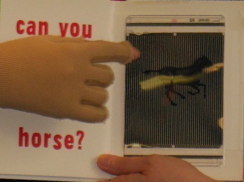 The pictures in Gallop! are made from a combination of kinegrams and lenticular images. A series of pictures have been cut into vertical slices and the slices alternate across a page: