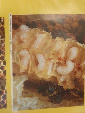 Larvae hatch out of the eggs. Bee larvae look like rolled up socks!