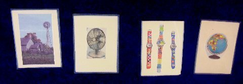 (farm with windmill, table fan, 3 watches, globe- Which three do you think go together?)