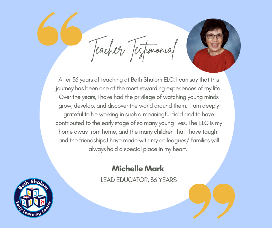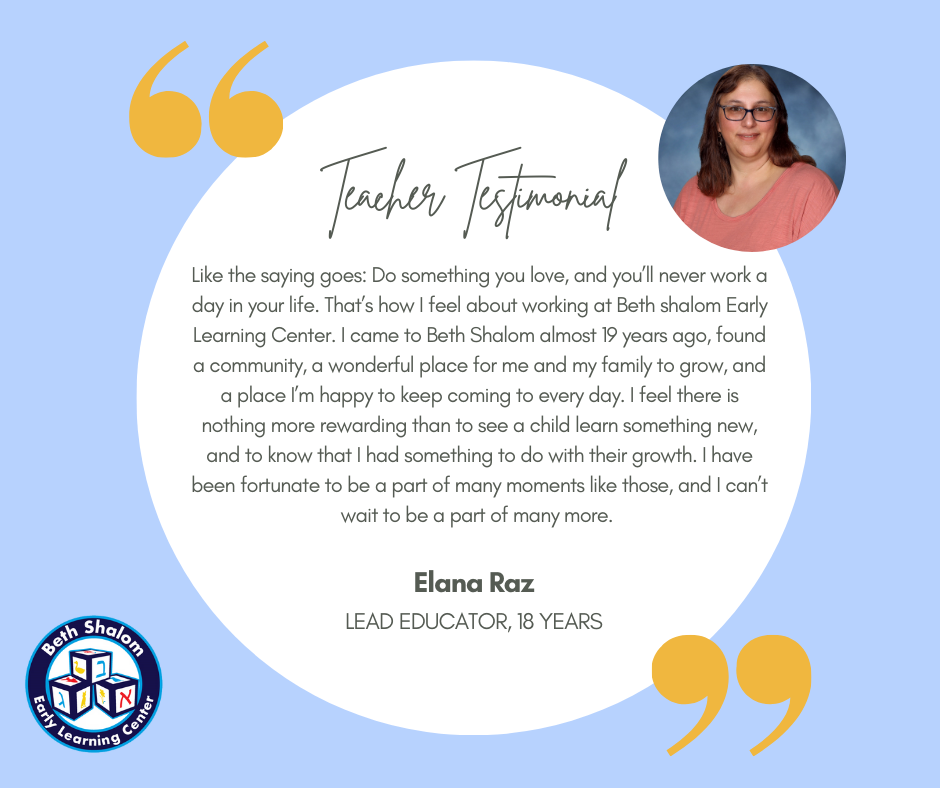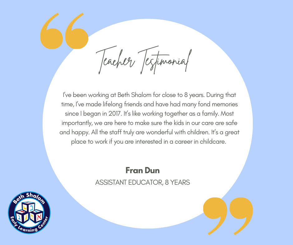 Check out the testimonials below to see why educators have chosen to be a part of the staff and community at Beth Shalom ELC for over 30 years.